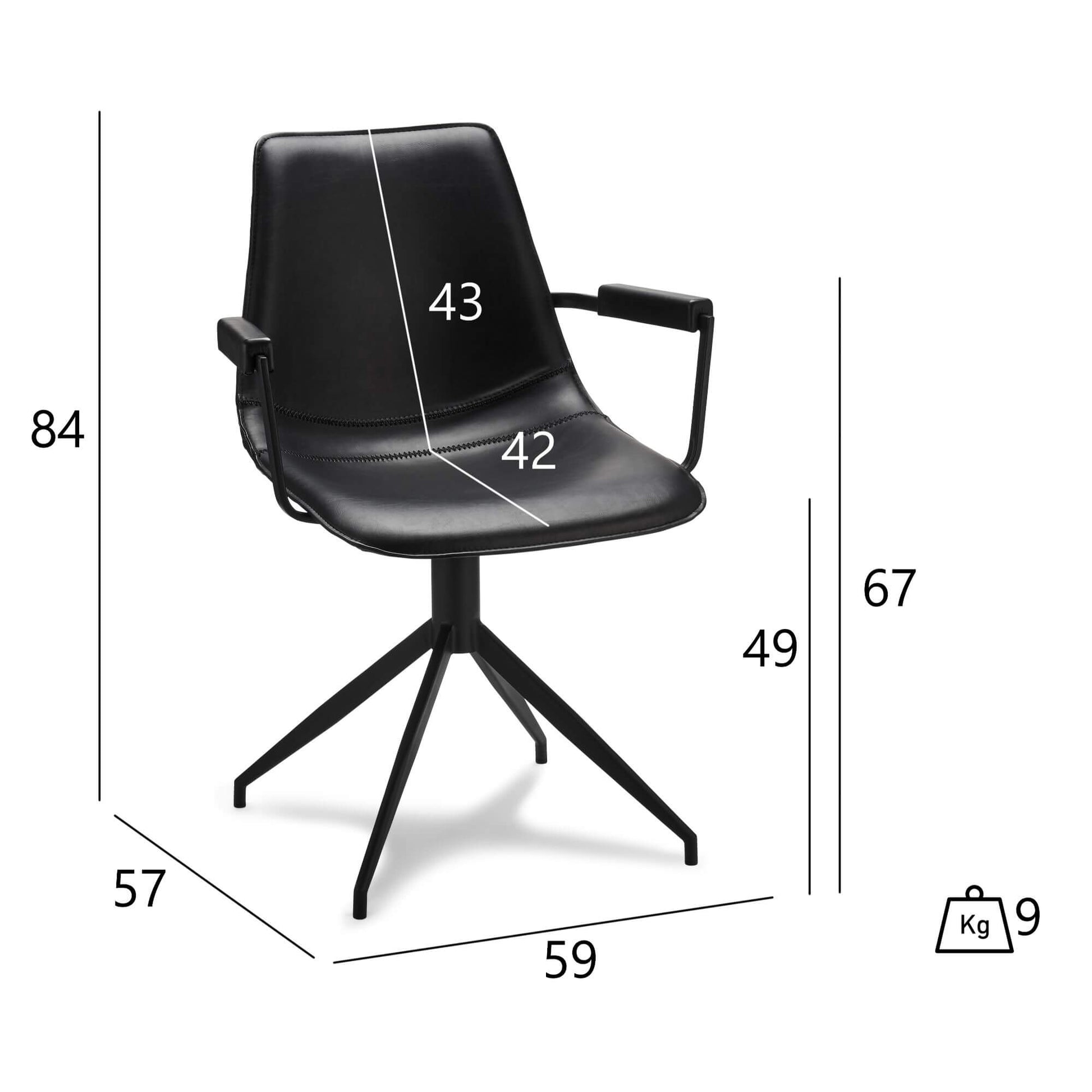 360° Drehfunktion – für maximalen Komfort und Flexibilität. Technische Details. Maße: 57 x 59 x 85 cm. Sitzhöhe: 49 cm | Sitztiefe: 42 cm | Sitzbreite: 46 cm. Max. Belastung: 100 kg. Material: Kunstleder (100 % Polyurethan), Metallgestell.
