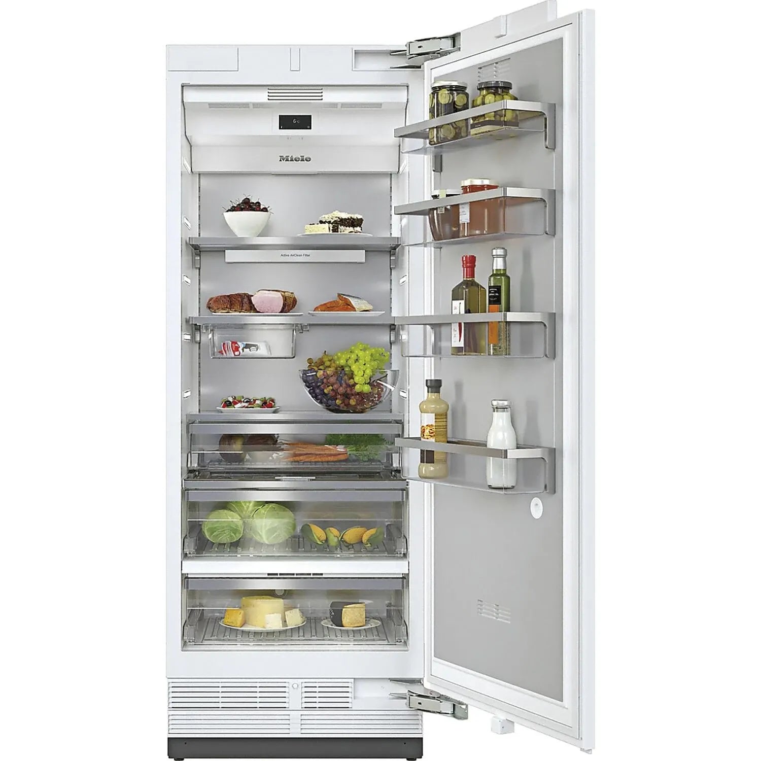 Miele K 2802 VI MasterCool ist ein side by side fähiger XL-Kühlschrank zum Einbau in den Küchenschrank. Er verfügt über 497 Liter Volumen, 2 Ablageflächen (höhenverstellbar), 1 VeggieBox, 2 Frischeschubladen, SlidingShelf (verschiebbare Schubladen unterm Glasboden für Kleinteile) und 3 Innentürabsteller. Funktionen, wie das Frischesystem MasterFresh mit perfekter Temperatur und Luftfeuchte, das farbige Touch Display MasterSensor und die smarte Steuerungsoption mit Miele@home gehören ebenfalls zur Ausstattung.